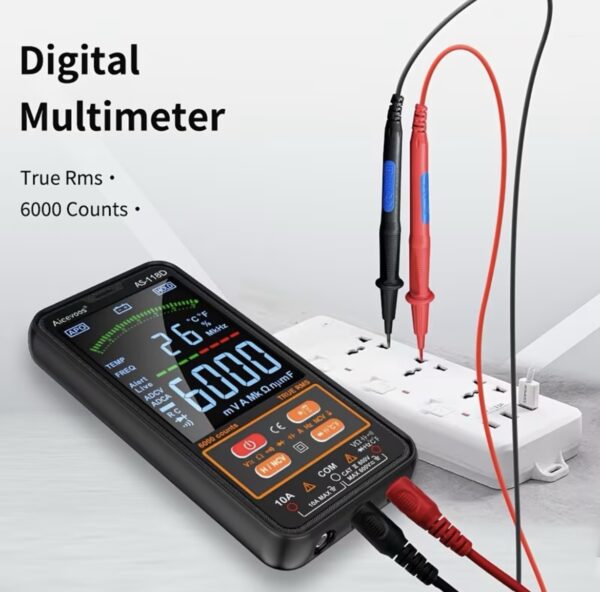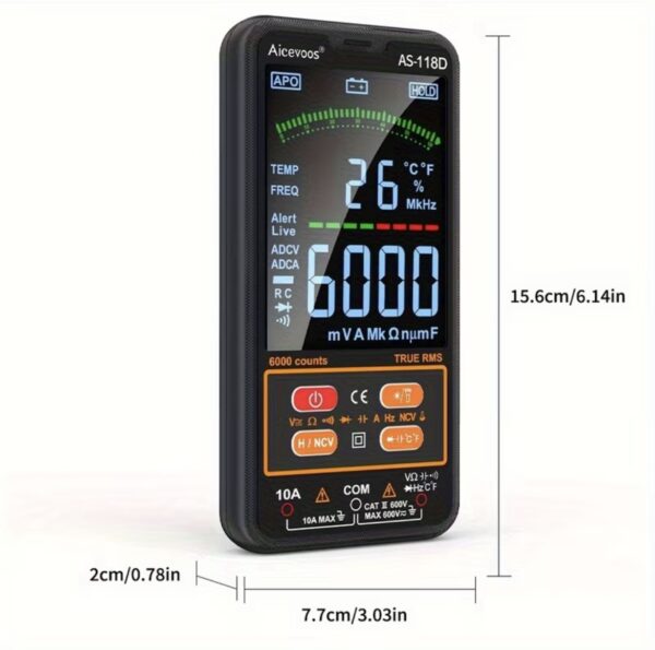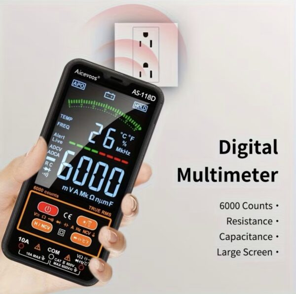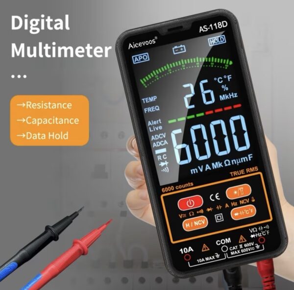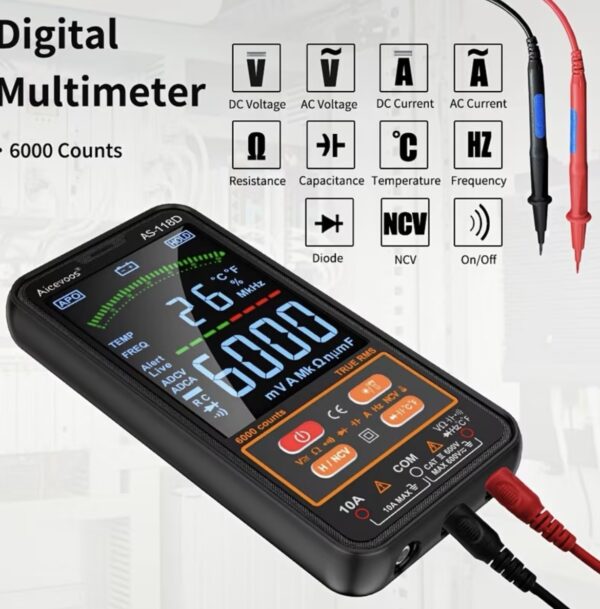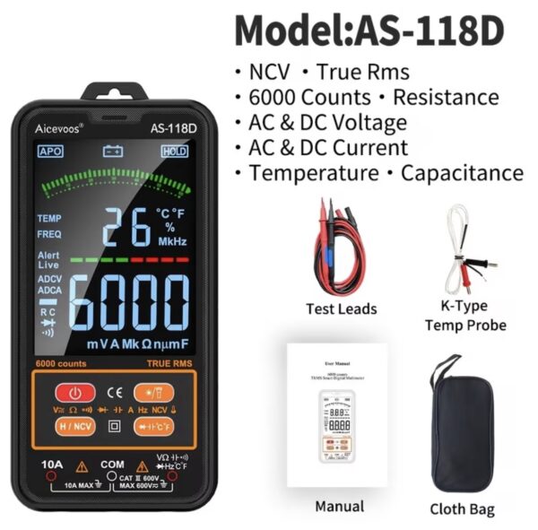 El multímetro digital inteligente Aicevoos AS-118D (6000 cuentas) es una herramienta automática y fácil de usar, ideal para mediciones eléctricas (voltaje, corriente, resistencia, capacitancia, temperatura, continuidad, NCV y diodos). Destaca por su modo inteligente, que detecta automáticamente el parámetro a medir,True RMS, y su diseño compacto con pantalla LCD a color de 4 pulgadas, siendo seguro (CAT III 600V) y portátil.
